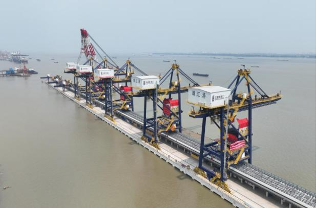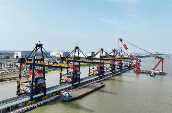 6月2日下午位于靖江經(jīng)濟(jì)技術(shù)開發(fā)區(qū)的深國際智慧物流中心碼頭5#卸船機(jī)上部結(jié)構(gòu)在浮吊的精細(xì)操作下,與下部結(jié)構(gòu)平穩(wěn)“對接”,順利完成拼裝。