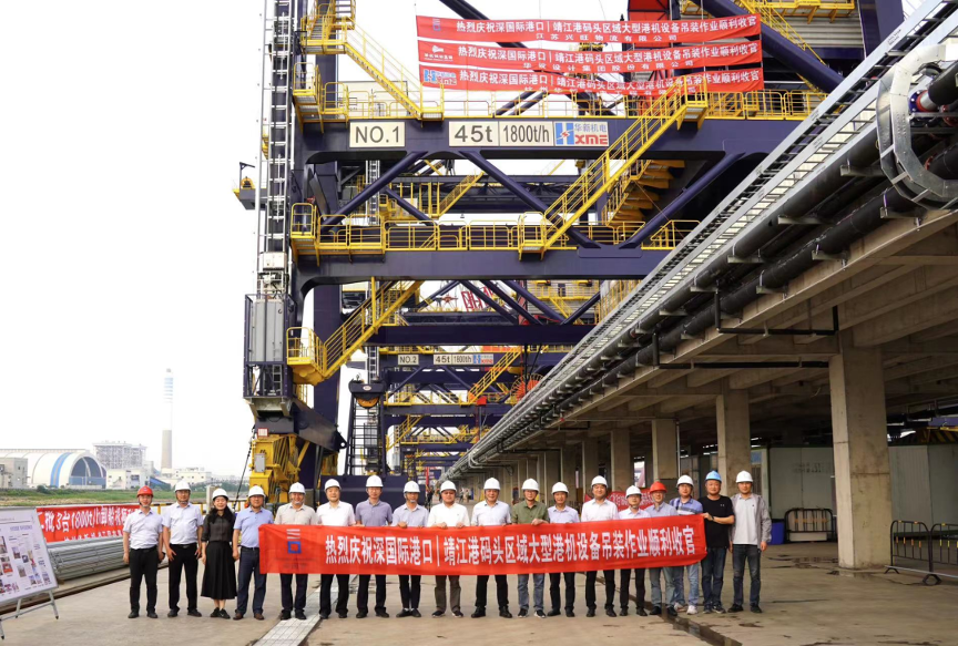 靖江項(xiàng)目主碼頭布置5臺卸船機(jī)和3臺裝船機(jī),卸船機(jī)高約59米,單機(jī)額定效率1800t/h,總重量約1350噸,是目前長江沿線卸煤生產(chǎn)效率最高、外形尺寸及整機(jī)重量最大、自動化程度最好的抓斗卸船機(jī)。裝船機(jī)額定效率為5400t/h(2臺)、3000t/h(1臺)。卸船機(jī)和裝船機(jī)對設(shè)備料斗部分采取了特殊措施,提高設(shè)備的環(huán)保性,并分別配置了高精度動態(tài)計(jì)量斗和高精度整列式皮帶秤,為打造智慧、綠色、高效、安全項(xiàng)目提供堅(jiān)實(shí)的硬件基礎(chǔ)。