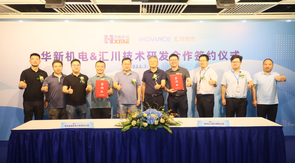 2023年7月12日,江蘇蘇州,杭州華新機電工程有限公司和蘇州匯川技術有限公司舉行了研發(fā)合作協議簽署儀式,華新機電副總經理沈策和匯川技術重工裝備SBU總裁王小杰作為雙方代表,在華新機電總經理王吉如和匯川技術聯合創(chuàng)始人、匯川書院院長張衛(wèi)江的見證下,簽署了雙方在“電力系統(tǒng)裝備國產化關鍵技術研發(fā)”的戰(zhàn)略合作協議。